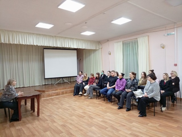 В актовом зале перед присутствующими выступили специалист по профориентационной деятельности А.С.Нехорошева и заместитель директора по учебно-производственной работе Е.М.Костылев, Они познакомили со специальностями колледжа и особенностями приёмной компании 2026 года, уделив особое внимание Федеральному проекту «Профессионалитет», рассказав о его преимуществах.